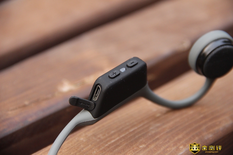 耳机的充电接口有胶条保护,防水防尘,同时音量调节键和工作指示灯也都设计在耳机侧边的这个小突起上,这应该也是电池的所在位置。