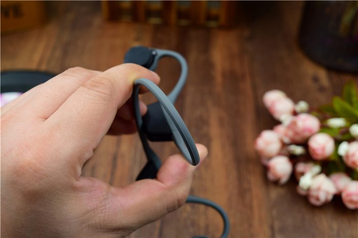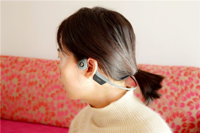 佩戴时需要注意下,需要先把耳机挂在颈部后面,然后让扬声器贴在耳朵前面的脸颊骨上,能够带来更好的音乐体验,另外耳机还采用了眼镜兼容设计,可同时佩戴耳机和眼镜也能保持舒适性。