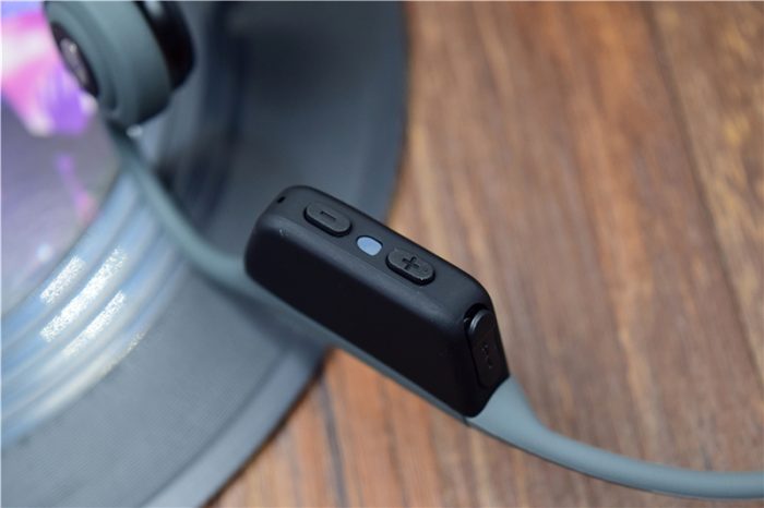 另外在右侧扬声器上方还有音量+键和音量-键,短按微控制音量,长按2秒为切换歌曲,按键中间是LED指示灯,可以根据指示灯颜色了解耳机当前工作状态,正常使用下为蓝色闪烁。另外在音量+键上方是充电口,采用Micro USB接口,表面还加入了防尘塞;在音量-键下方是麦克风孔,可以用来通话,或唤醒语音助手时接收语音指令。