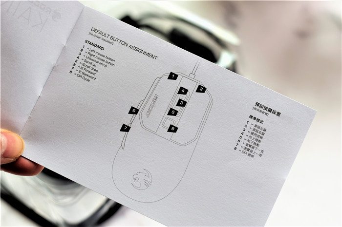 将包装从上方打开,拉出透明的内包装就可以直接看到鼠标了。随鼠标还有一张宣传卡片、使用说明书。说明书上有对鼠标功能等的详细介绍,建议在使用前详细阅读一下。
