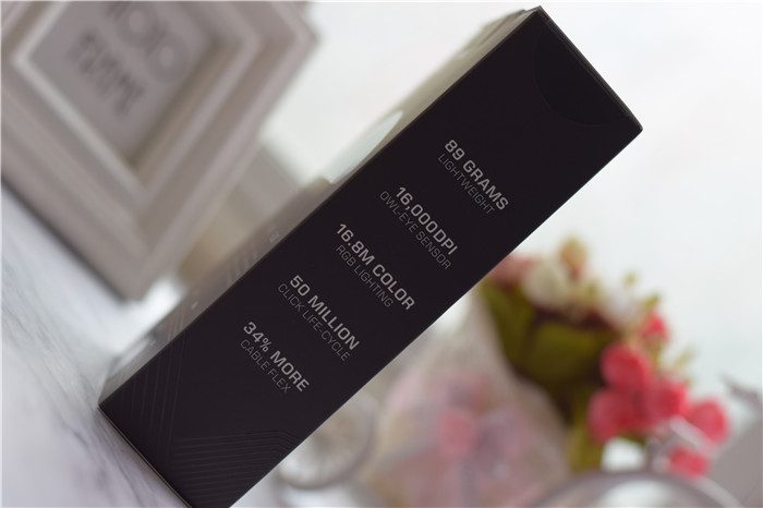 包装的背面则印有产品的一些详细信息,两个侧面印有产品的名称和一些主打特点,比如16000DPI、RGB灯效等等。
