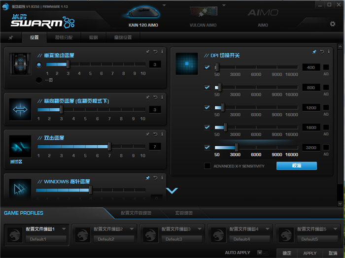 Kain120 AIMO的界面包含设置、按钮分配、照明、高级设置四大模块。“设置”中可以对垂直滚动速度、横向翻页速度、双击速度、WINDOWS指针速度、DPI等进行个性化设置。