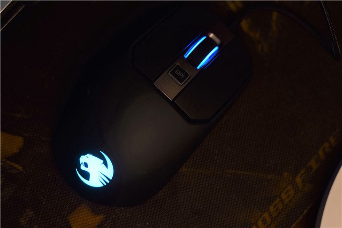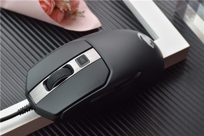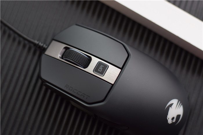 鼠标的滚轮有比较合适的阻力,滚动起来手感不错。滚轮位置有一条银色的修饰,银黑配色让整个鼠标更加好看。正面的中央位置设计有DPI键,可以根据需要调节DPI,非常方便。