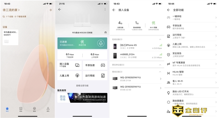 进入华为智能家居手机APP后首先要做的就是将路由器进行添加绑定连接操作,这样才能有效的管理路由器,第一步查找路由器(先通过Wi-Fi将手机连接至路由器)之后会显示一个设备,这个设备就是路由器的绑定帐号,通过绑定之后就可以进行管理界面了,从管理界面上看其实和网页端的还是有些区别的,首先一点是比较的简单化,并没有想象的复杂,基本上从来没有设置过的人群,都会跟着提示可以轻松的设置完成,而且支持远程管理、上网保护、商城购物、客人Wi-Fi、Wi-Fi定时开关、玩转智能设备等。