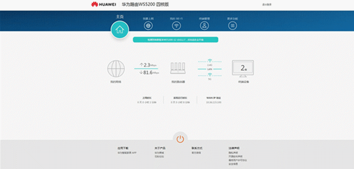 当我们进入路由器的主界面后,可以看到设置界面非常的简单,也非常的易懂,这里需要注意的是在默认的情况下华为WS5200四核版的Wi-Fi信号2.4GHz和5GHz为双频合一的,也就是5G和2.4G同为一个Wi-Fi名称,在同等信号强度下优选更快的5G信号,当然也可以关闭此开关,进行单独分开使用。