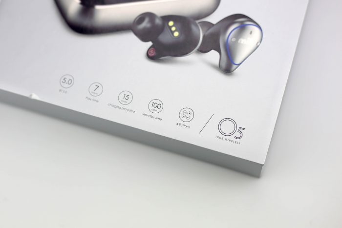 盒子底部是一长串的产品特色,可以看到这款耳机采用了蓝牙5.0、单次7小时续航!以及底座15次的供电次数和100小时+的超长续航!