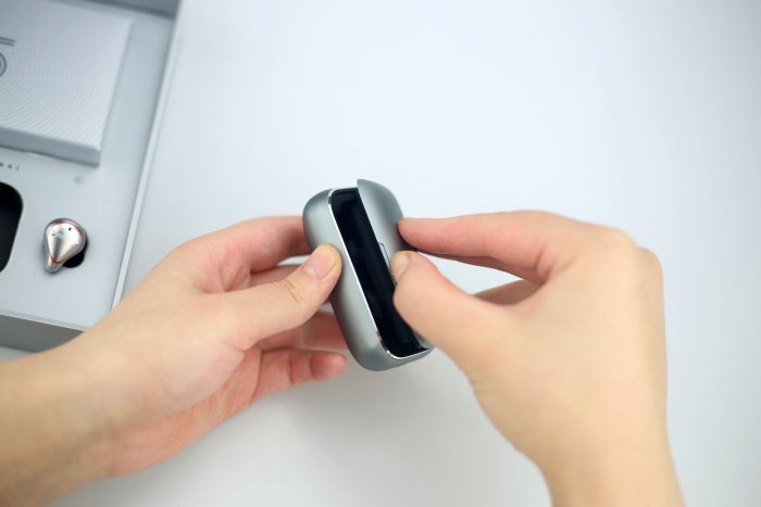 接下来看看这款充满“未来感”的耳机收纳盒。整个收纳仓都采用了金属的设计,并且打磨的非常光滑,表面还做了阳极氧化喷漆处理,几乎不会沾染指纹!