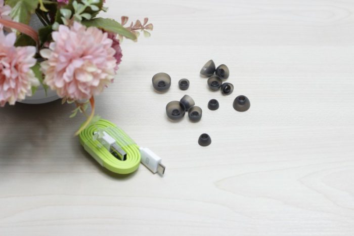 6对不同尺寸的耳套满足了不同用户的需求,当然不同的耳套带来的声音也是略有差别的,贴合度越高声音以及牢固性更好些,还有一条草绿色的充电线,显得非常有运动年轻气息。
