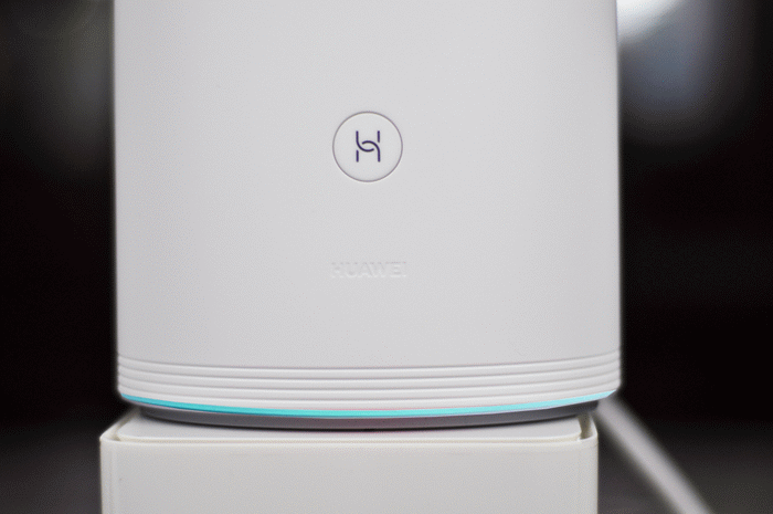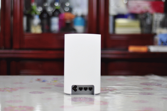 母路由的底部是环形状态指示灯,在未联网时,呈现粉色光晕,成功连接后,则呈现海蓝色光晕,内置天线的方案也使得路由器外观看起来简约优雅,感官体验非常漂亮。