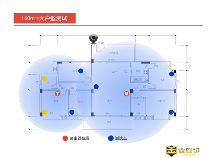可以看出,在6处蓝色标记位置测试,网络信号基本保持满格,使用子母装的平均下行速率可达86.1Mbps,平均上行速率可达39.4Mbps,在原本近乎盲点的2处黄色标记位置测试,几乎与蓝点的速率相当,网络扩展效果比较突出。