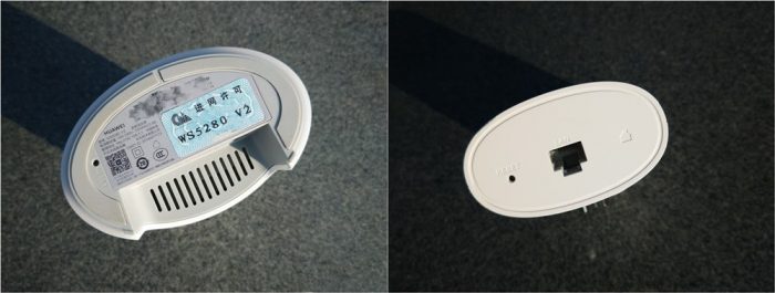 子母路由的顶部都分别印着相同的华为标志性的八瓣菊花与华为拼音,这里就不做展示了。子路由为保持美观度将复位按键与有线扩展孔位于设备底部,或许是复位键不常用的关系,母路由的复位按键位于底部靠近防滑硅胶垫其中一侧,此外底部还贴有包含设备入网许可证以及硬件序号等产品助记信息。散热方面,母路由仅在凹槽内壁顶部提供一排条状散热区。