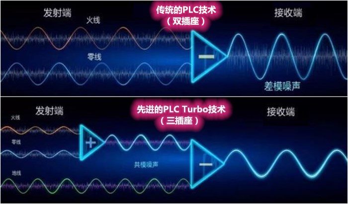 不过这里值得一提的是,与传统应用电力猫不同,华为路由Q2 Pro采用的是自研凌霄5630千兆电力猫芯片,在技术上采用更为先进的PLC Turbo技术。相比旧式依托零、火线进行数据传输,易受用电干扰双插PLC设备而言,革新后实现火、零、地线三项数据传输,并且通过优化芯片底层算法大幅度降低用电对传输产生的噪声干扰,在稳定组网同时性能得到成倍提升。为了更直观了解两者的区别,笔者网上找来了新旧PLC技术的波形对比图片,让大家更简单直观的了解产品在物理层面的运行方式。