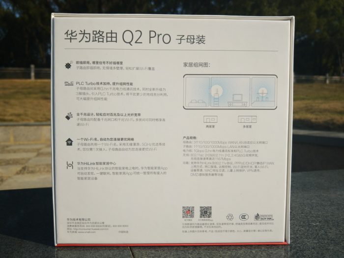 通过官网了解了下,这款华为路由Q2 Pro 产品是于今年3月初上线销售的,售价在799元区间。提供了一子一母标准版,以及适合更大覆盖区域的一母多子的选择版本。不同的版本适用于不同结构场景,本次笔者体验的是标准版本的子母套装。通过包装可以非常清楚对产品有大致了解,作为物联网产品在包装左下角还印有“HUAWEI HiLink”标识。