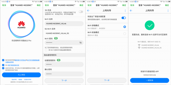 华为路由Q2 Pro在初次连接路由器WIFI时,会弹出华为标志性的路由向导“四步曲”,用户在正常联通网线的情况下仅需简单四步操作即可完成路由器的配置。与笔者之前体验的ws5200稍有不同的是,Q2 Pro支持单独对管理密码进行设置,省去了设置完成后在进路由管理界面修改管理密码的步骤。