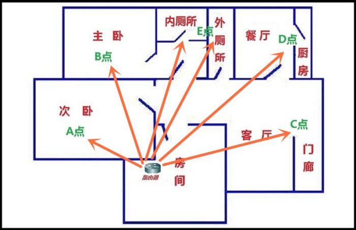 笔者测试环境为三室一厅的结构,采用单点辐射区域的测试方式针对华为路由Q2 Pro子母路由器进行测试,分别通过对单一母路由、子母双路由两种情况下,在信号覆盖能力、传输速性能上做综合测试。并且通过简明的图表方式展现。整体测试面积大约100平米左右,分别选定三个开阔房间、多墙之隔且有电器设备的内外厕所、电器较多且距离较远的厨房作为六个基准测试点。