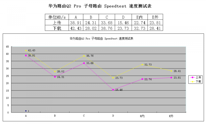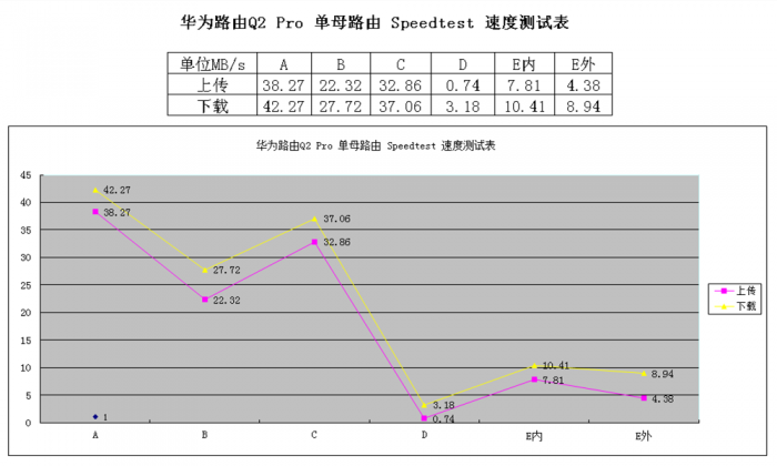 图中紫色代表上传数据,黄色代表下载数据。从图表波形上可以知,最佳理想的上网区在A、B、C这三个点,反差较大的D点、E内、E外作为电器干扰较为集中的区域,在2.4G下D点只能达到艰难的刷网页程度,这也是很多靠增强信号进行单点覆盖传统路由设备无法解决的问题。