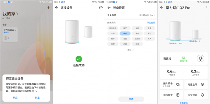 华为路由Q2 Pro作为华为“全家桶”的一员,想要实现手机端便利操作就需要下载华为的智慧生活APP。绑定的步骤也非常简单,用户仅需连接路由器本身的WiFi并点击绑定即可,智慧生活APP就会自动完成后续的连接步骤,根据自己使用区域选择对应的助记房间完成即可,此时就可以看到熟悉的设备管理界面了。