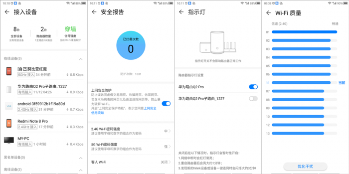 此外,在接入设备界面提供了非常清晰的数据信息,并且通过华为云端的设备信息库可正确识别接入的网络设备名称,对于较老的或未收入的设备则以当前系统+机器码的形式进行展示。在安全报告中还为用户提供不良信息拦截功能,并且拦截信息将会通过日志方式记录并对管理者进行展示。在指示灯方面考虑的也很贴心,在操作界面可以看到华为路由Q2 Pro针对子母路由均可实现独立的指示灯开关操作。对于WiFi信道质量也为用户提供解决方案,用户可以根据扫描报告,让路由器自动将频段调节至畅通线路,以便获得更好的连接质量。