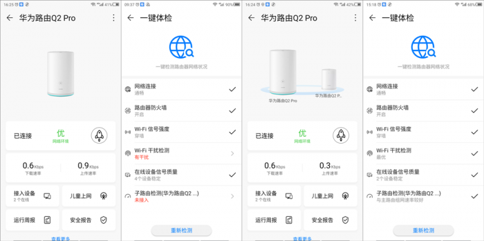 在华为路由Q2 Pro 的 APP端页面还做了个非常人性化的动态展示,用户可以通过路由管理页面顶部的动态图片来了解母机与子机的互动情况,若仅有母机图标则说明子机的电力猫路由设备没安装或是运行异常,如果看到的是一大一小两个路由图标并且底部还有蓝色光圈闪动则代表设备同时在线并且通讯正常。同样的,用户也可以通过应用内提供的一键体检功能对设备联接情况进行诊断。