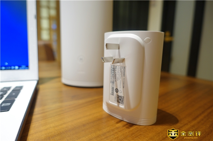 下面来说一下华为Q2 Pro的子路由,华为Q2 Pro子路由的设计明显要比母路由小很多,材质方面和母路由的材质一样,都是塑料的机身材质,带以磨砂工艺,从外观尺寸上来看,子路由只有75*46*103mm,重量方面为200g,轻巧的同时也让使用上更加的方便。