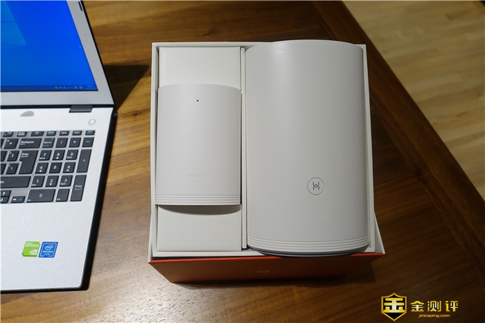当打开包装盒,可以看到产品被包裹的非常好,包装盒内有两枚路由,一大一小,小的是子路由,大的是母路由,所以被称为子母路由,在包装清单方面,主要有华为Q2 Pro子母路由、电源适配器、网线、使用说明书组成。