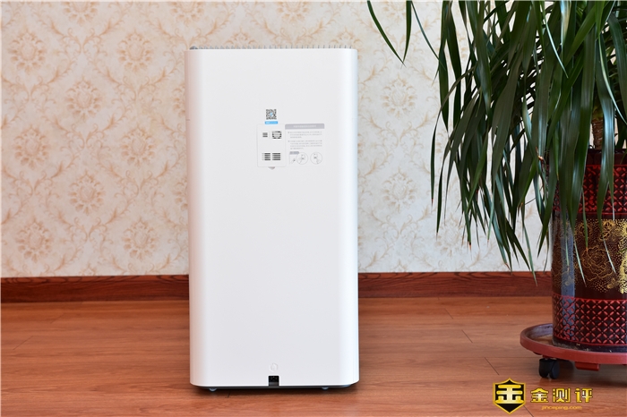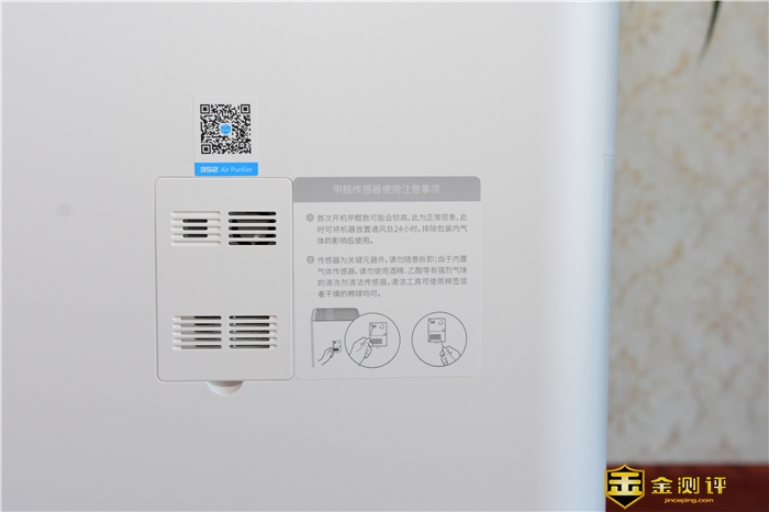 空净背面顶部中间位置为其传感器(其中上方为PM2.5传感器,下方为HCHO(甲醛)、VOC(挥发性有机化合物)传感器),底部中间位置为其电源线连接孔。