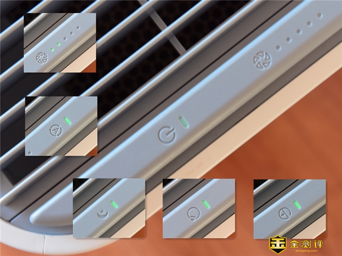 格栅右侧的长条为352 Y100C的控制面板,从左到右依次为电源按键、风量按键、自动按键、睡眠按键、灯光按键和童锁按键。