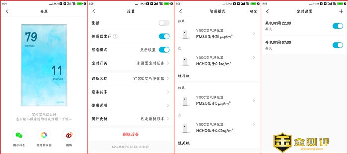 通过分享按钮可以将此事室内外的PM2.5对比状况发送到社交媒体,设置界面中可以操控童锁开关、传感器常开/关闭、智感模式开关及设定条件、定时开关等。