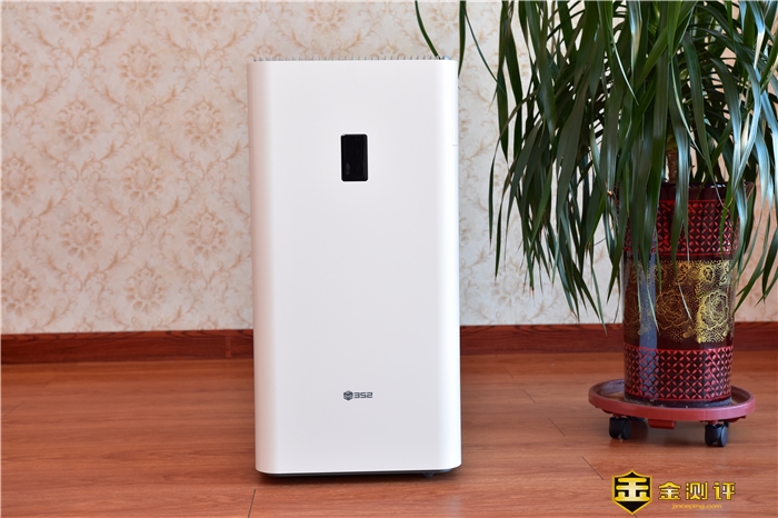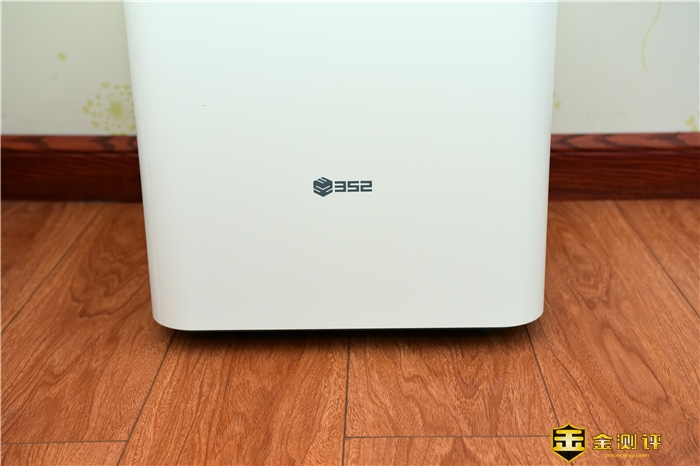 352 Y100C空气净化器的机身呈纯白色,正面顶部的中间位置为其甲醛&PM2.5双数显显示屏,下方中间位置为352科技的品牌LOGO。