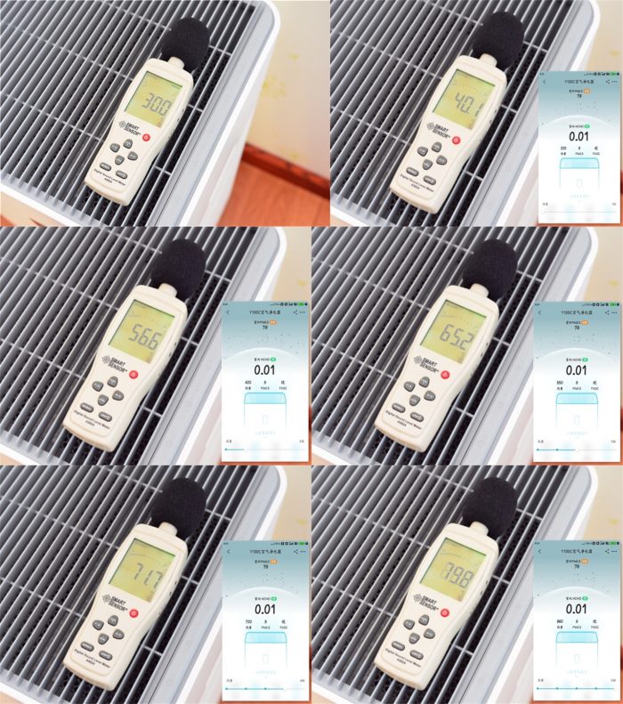 噪音也是我们在日常使用过程中不得不考虑的一个重要问题,我们在一个封闭的室内测试得到在空净未工作时环境噪音约为30dB(噪音测试仪量程为30dB-130dB),1档时噪音为40.1dB,2档时为56.6dB,3档时为65.2dB,4档时为71.7dB,5档时为79.8dB。
