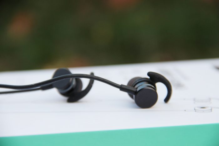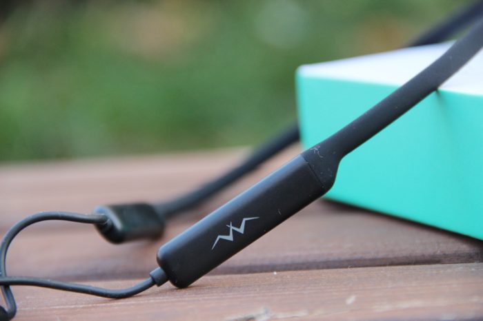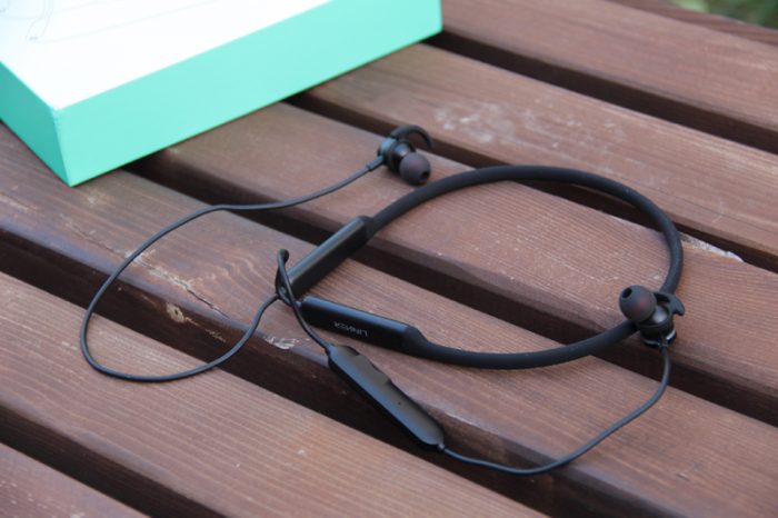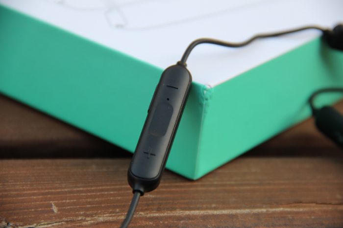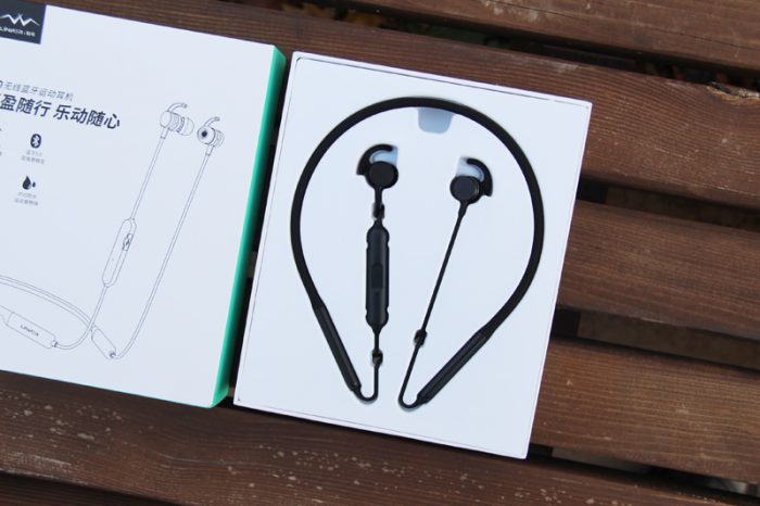 打开包装盒,直接就可以看到耳机,这是一款“挂颈”式蓝牙耳机,而并不是当下流行的那种“”真无线”耳机,两个耳塞间还是有线缆互联,只是省略掉了耳机与播放设备间的线缆连接。