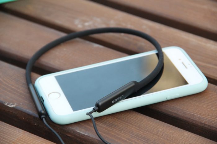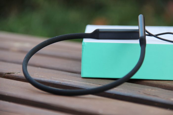 我们主要还是看耳机吧。这款耳机采用了“挂颈”式设计,两个耳塞间有一个硅胶材质的“颈挂”,我用手试了一下,柔软度相当好,里面有一根记忆钢丝,无论怎么弯折,都可以瞬间恢复到原来的曲张度,不会变形。