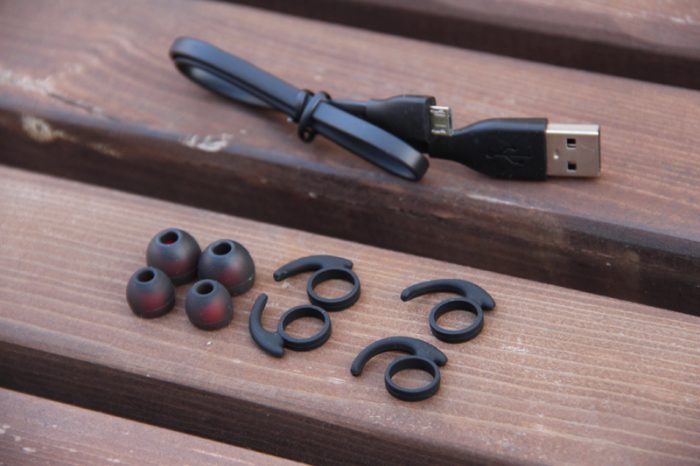 随机附送了一根MicroUSB充电线缆,还有2组不同大小的耳塞,还有2副运动耳挂,用于运动时固定耳机,防止脱落。