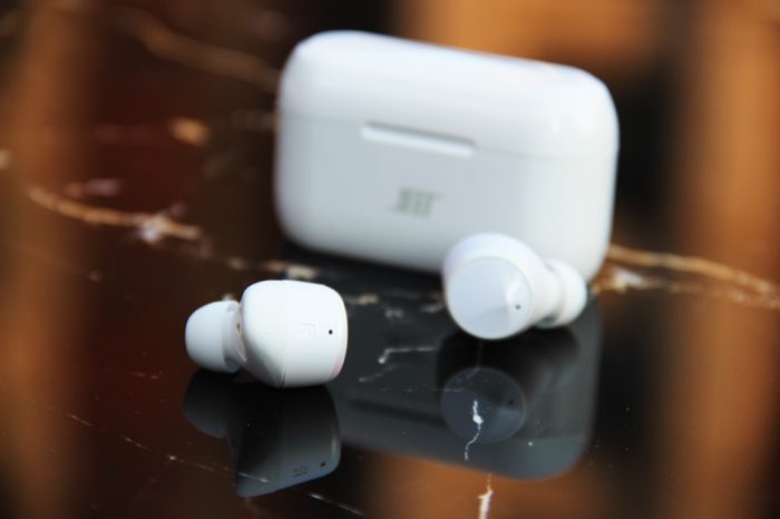 来看看耳机。这款JEET Air Plus 的耳塞表面非常漂亮,并不是单一的白色平面,而是泛着一种珍珠母贝的光泽,在不同的光线下闪现出不光的色彩。耳机采用触控操作,触控面积就在麦克风上方的这个三角区域,稍加用力的敲击,就可以让耳机感应得到。