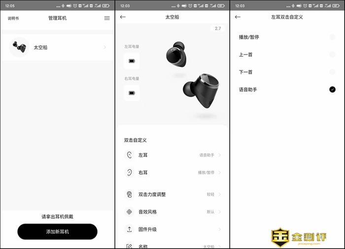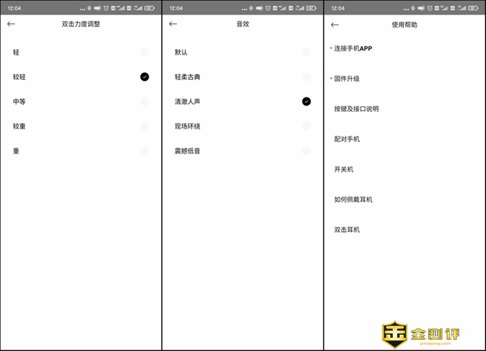 用户还可以选择双击按键的力度,我觉得当然是越轻越好了。JEET Play还预设轻柔古典、清澈人声、现场环绕和震撼低音4种音效模式,切换不同模式试听一下,声音有些许变化。此外,通过JEET Play还可以对耳机的固件进行升级。