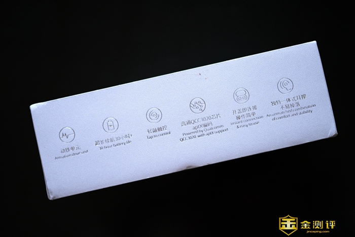包装盒的侧面印有JEET Air Plus主要亮点,包括动铁单元、超长续航超过30小时、轻敲触控、高通QCC3020芯片、支持apt X解码、开盖即连接设计和独特一体式耳撑。