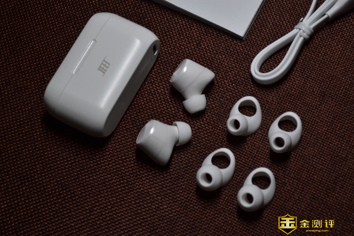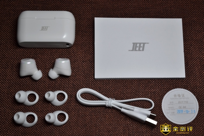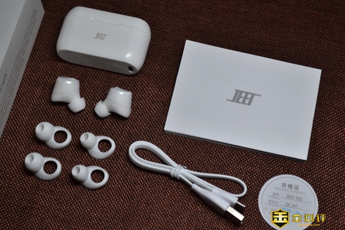 全家福在这里。看这里看这里。JEET AIR PLUS耳机充电仓,耳机本体,耳套共三套,大中小三种可选。使用说明书,TYPE-C充电线,合格证。