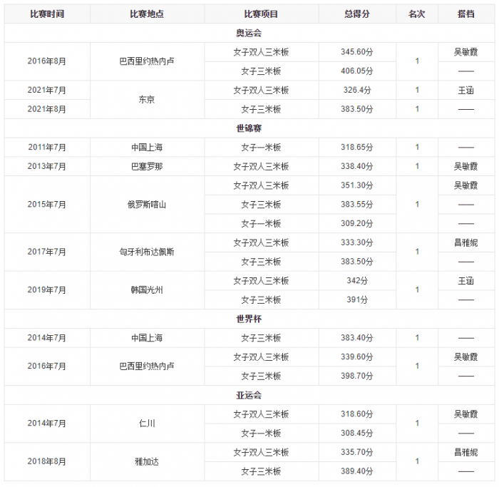截至2021年7月25日,施廷懋在女子三米板和女子双人三米板项目上赢得3枚奥运金牌,7个世锦赛冠军,6个世界杯冠军和4个亚运会冠军。