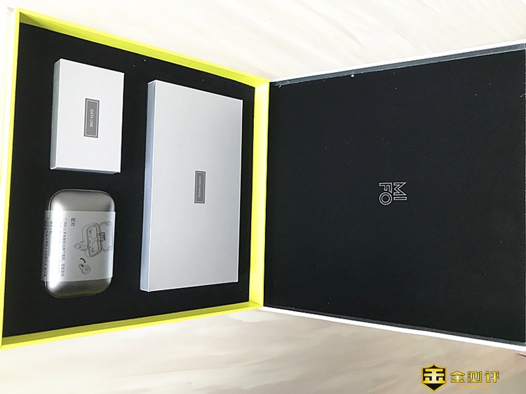 打开后整个魔浪O7包装盒的内部的排列简直完美的如同艺术品,蓝牙耳机电池仓和两个纸盒装的配件呈现在用户眼前,主配件3个区域被从容完美的分隔、镶嵌在海绵材料定制的模壳当中,在精简美观的同时最大限度的反馈出厂家在防止运输压损方面的用心。