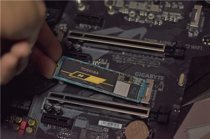 将其中一个的散热装甲拆掉,然后倾斜大概30度角将东芝RD500 NVMe 固态硬盘插入到M.2硬盘接口上。