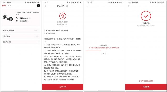 连接耳机后,可查看左右耳电量,还可进行固件升级、调整均衡器、查看产品引导。