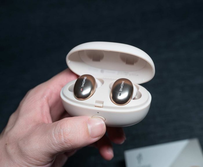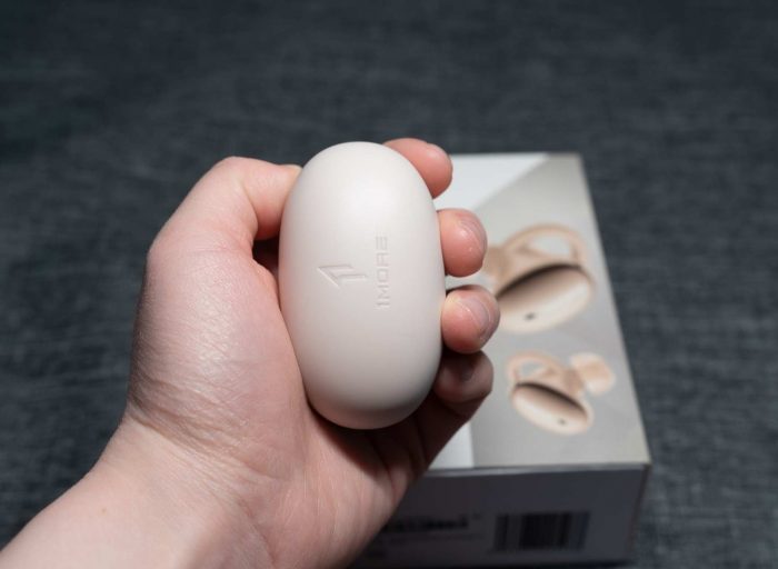 充电盒顶部印有1 MORE品牌logo,颜色与充电盒身颜色一致,底部印有品牌公司名称。其余部分没有印制任何的产品信息,整体外观干净、简约。