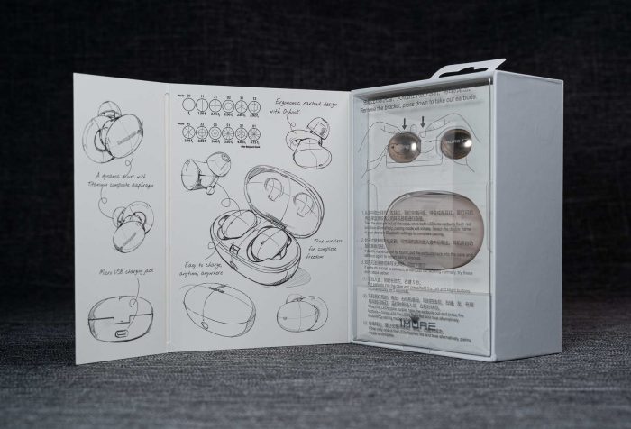 包装内侧还印有这款Stylish 真无线耳机不同阶段的设计图稿,感觉很有逼格!而这款耳机曾获得2019德国iF设计大奖。