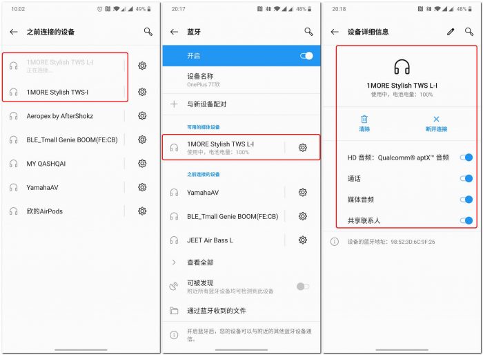耳机采用的是蓝牙5.0连接协议,连接迅速,并且很稳定。首次连接后,下次再次连接时可自动配对。同时,连接手机时,分别对应了左右耳,并可在手机中查看剩余电量。耳机连接时还会语音提醒:蓝牙正在搜索、蓝牙已连接、蓝牙已断开等。