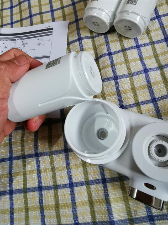 将滤芯保护盖旋开,可以看到内部封装的滤芯,加上附送的两个滤芯,一共是3个滤芯。