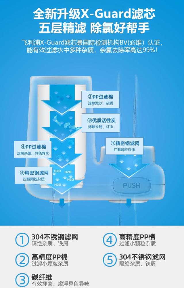 这根X-Guard滤芯内部使用椰壳颗粒活性炭材质拥有非常好的吸附能力,采用五层精滤设计可以过滤水中多种杂质,除氯更是达到99%