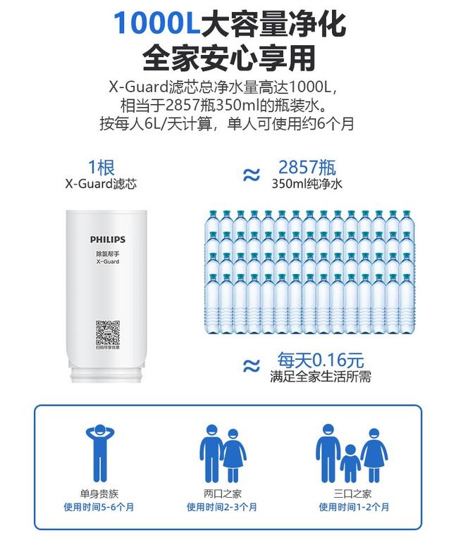 当然光净化率高是不够的,耗材功效也是关键,一根X-Guard滤芯可达1000升的大容量净化量,按一瓶水350ml计算,可以有2857瓶,按个人6L一天算,一个滤芯足够使用将近半年了,三口之家用2个月也差不多可以达到。这个耗材性价比还是很高的