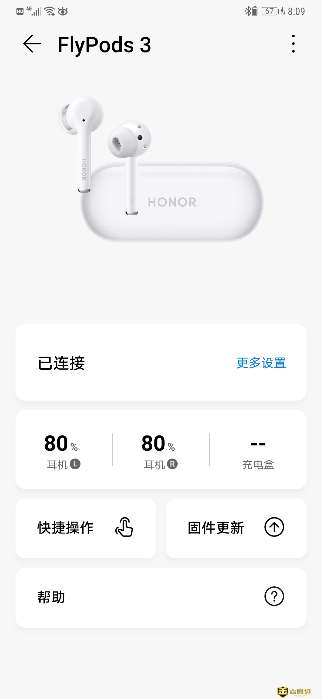 首先来到FlyPods3的主页面,这里能看到连接情况,还能看到两只耳机和电池盒的电量信息。下图里,充电盒子没有显示电量,是因为我把耳机取出来戴耳朵上了,如果耳机放回充电盒子,该页面就会显示出电量了。另外这款真无线耳机还支持固件更新,可以在设置为当手机连接wifi时自动更新固件,这一点做得很人性化,全自动更新,挺方便。