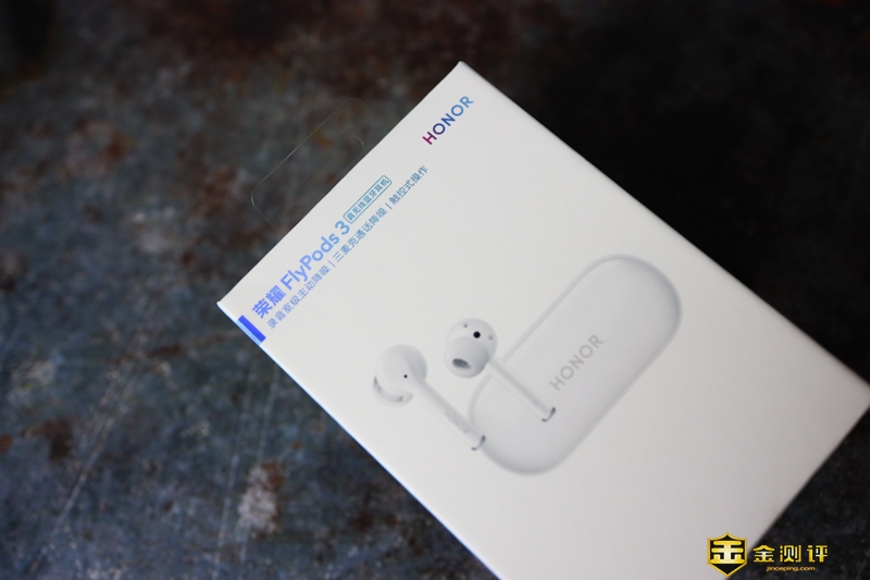 咱老规矩从包装开始看。FlyPods3的包装比较简约的,正面印着耳机的实物图,咋一看有点像airpods?无关紧要啦,国产品牌做跟屁虫的多了去了,荣耀算老几?!