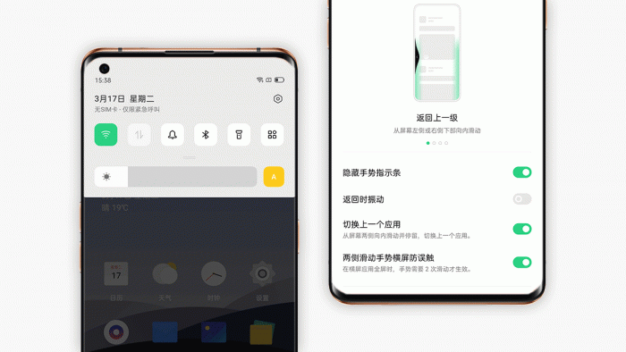 在系统交互方面也保持着主流定制安卓系统的趋势,顶部下拉快捷菜单和通知,再次下拉显示所有快捷图标和时间。屏幕左右两侧向内划动返回上一级,底部向上划动全局返回,底部上划停住呼出多任务。